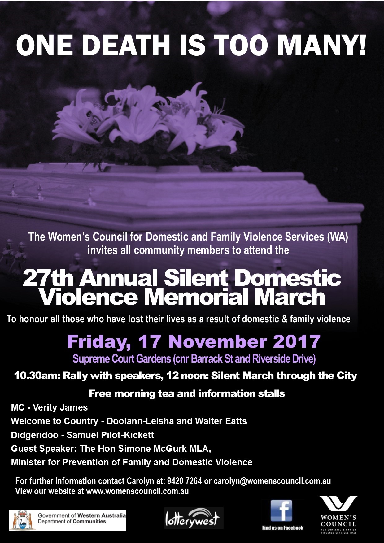 You can remember and honour those who have lost their lives to domestic violence by attending the 27th Annual Silent Domestic Violence Memorial March on Friday, 17 November from 10:30am at Stirling Gardens in the city. Click here to view the full flyer or click here for the media release from the Women's Council for Family and Domestic Violence Services.