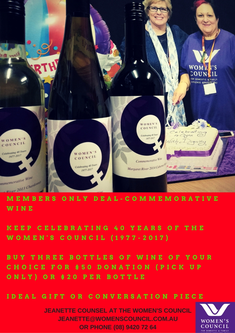 The Women’s Council for Family and Domestic Violence Services is celebrating 40 years (1977 – 2017) with a special commemorative wine label. It is available as a Merlot, a Chardonnay or a Riesling. You can buy three for $50 or individual bottles are available for $20. For more information, please click here.